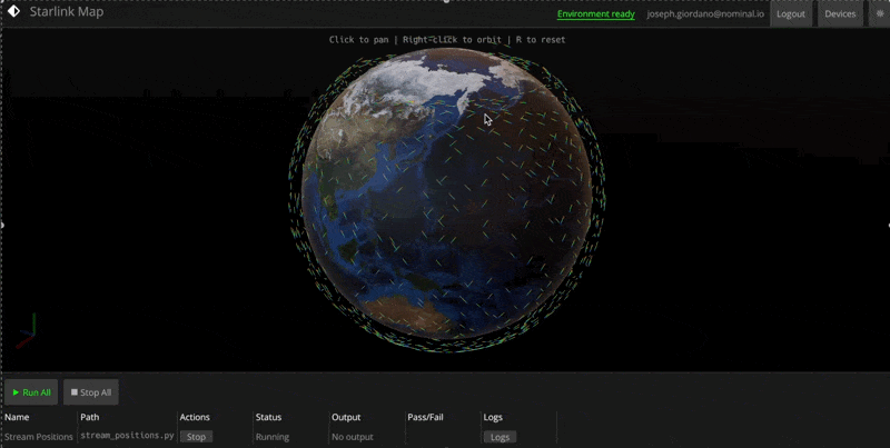 Nominal Connect is building the most advanced 3d simulation, mission replay, and asset monitoring environment that has ever been available to Python engineers. This includes the ability to visualize an arbitrary number of physical assets, each with independent behavior. With Nominal Connect, one engineer can deploy a monitoring dashboard for a 7,000-satellite constellation – in a single afternoon.